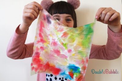 Let’s make some butterflies with colourful wings! Here is a paper tissue. Here is your brush. Now let‘s dip our brush in water and add some colour to it. What colour do you like? Red? Great! Now let’s make big dots on the tissue. Let them blur on the tissue. Wow! Make some more dots/blurs! Which colour do you want now?